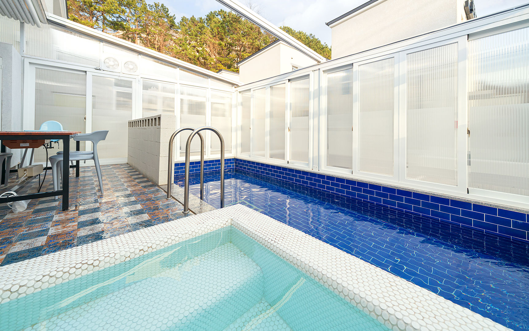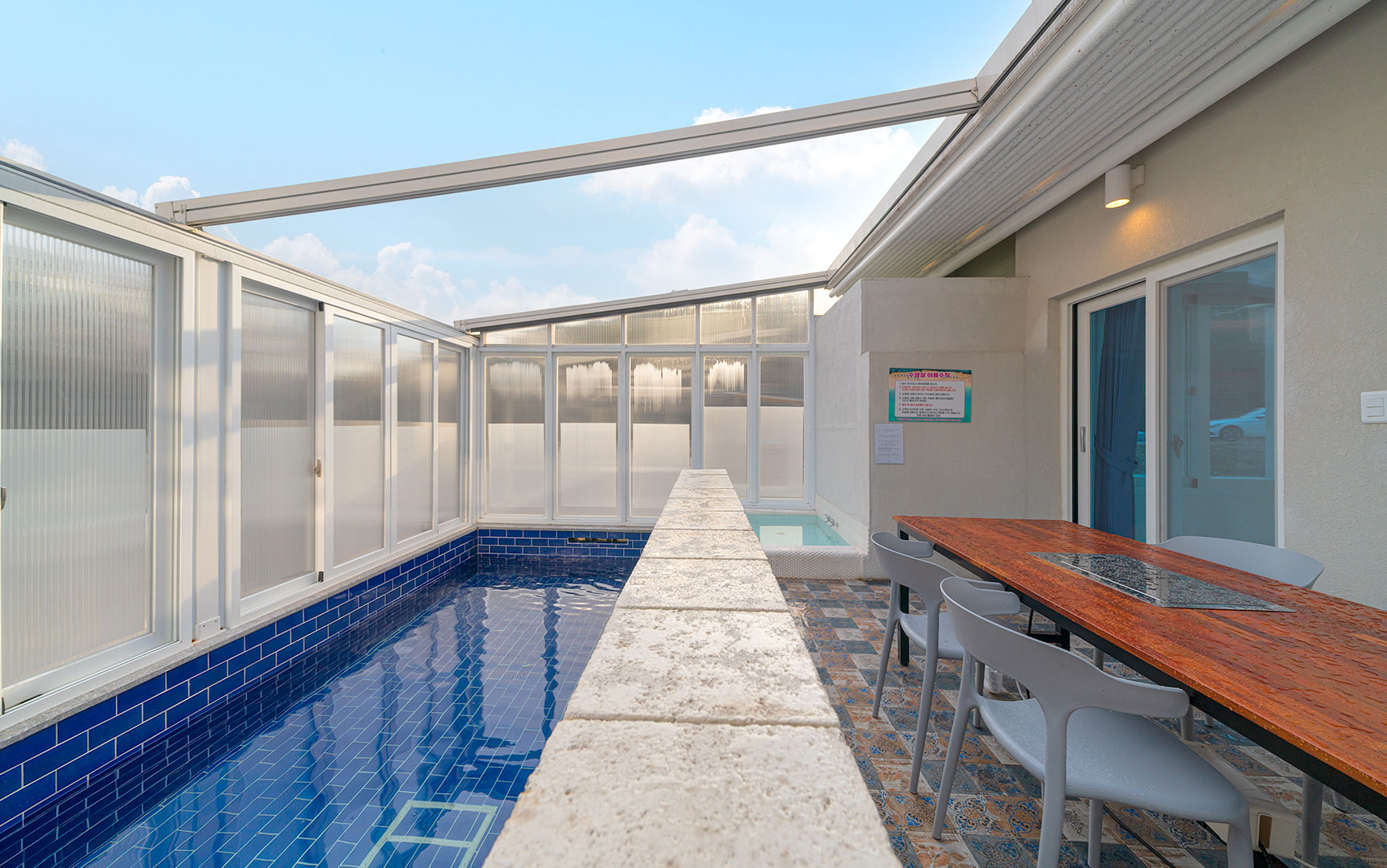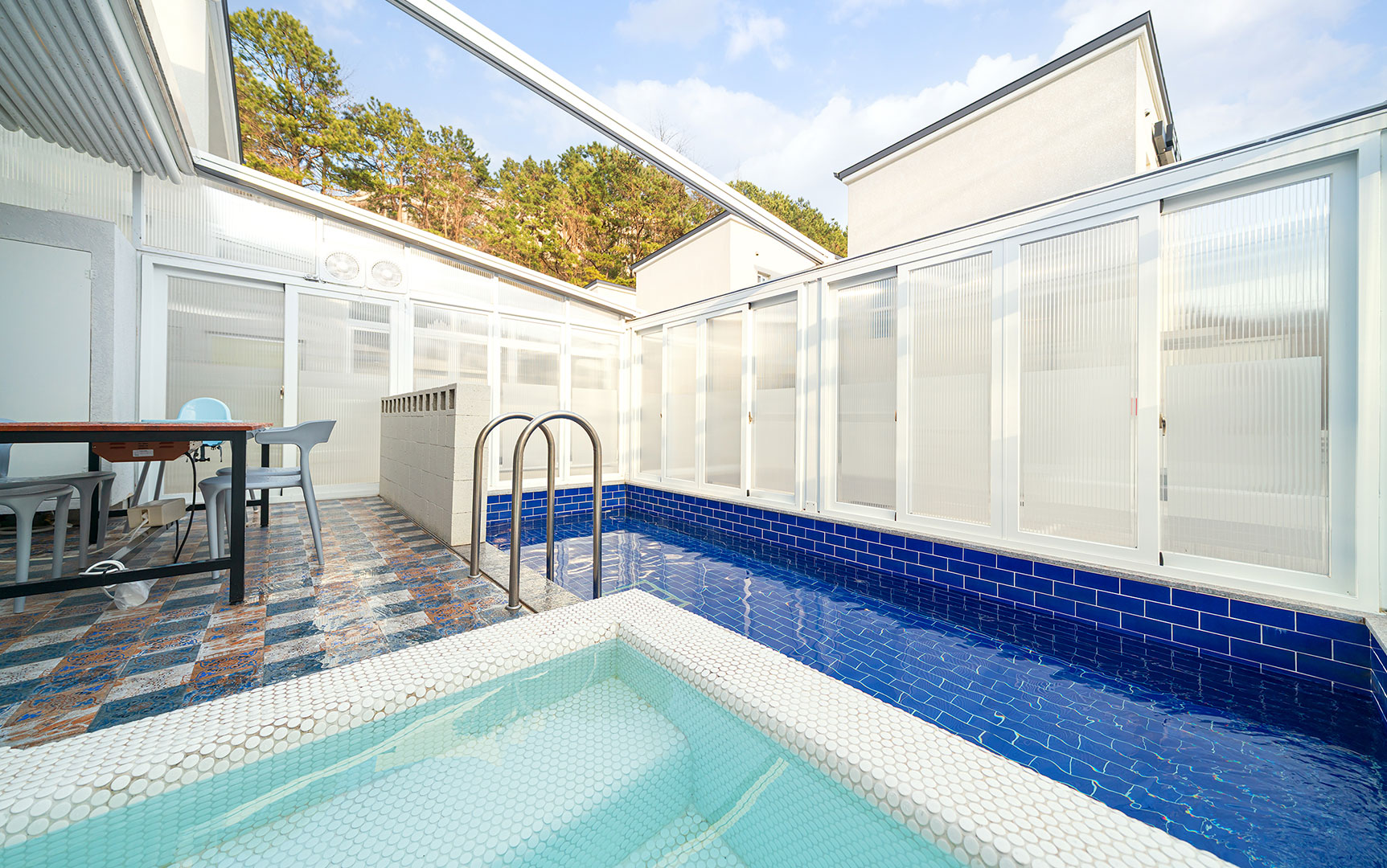 자연을 느낄 수 있도록 개폐 가능한 미온수 수영장과 자쿠지, 개별 바비큐, 찜질방 기준 2인 / 최대 6인